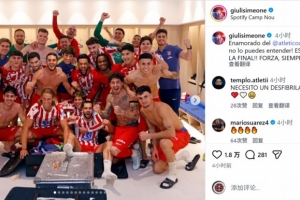 馬競(jìng)前鋒朱利亞諾·西蒙尼社媒曬出與隊(duì)友們?cè)诟率覂?nèi)的大合照,配文:“愛(ài)上馬競(jìng),這種情感你無(wú)法理解!我們晉級(jí)決賽了!加油,永遠(yuǎn)!”