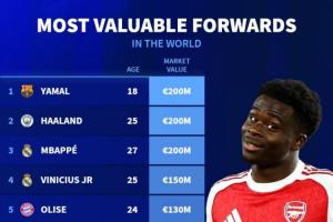 體育資訊03月08日訊 明天,德轉(zhuǎn)將會更新英超球員身價,德轉(zhuǎn)今天列出了現(xiàn)在的前鋒位置球員身價榜,亞馬爾、哈蘭德、姆巴佩2億歐居首。