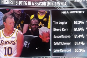 湖人VS尼克斯,轉(zhuǎn)播方曬肯納德數(shù)據(jù),本賽季肯納德三分命中率已經(jīng)來到50.3%,能排進(jìn)NBA單賽季歷史前五(至少出手175次及以上):