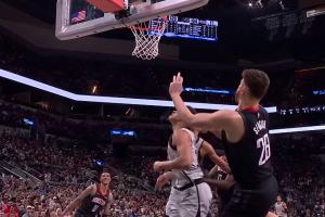 這球改成沒有犯規(guī)發(fā)生,小史密斯中投兩分算,馬刺球權(quán)