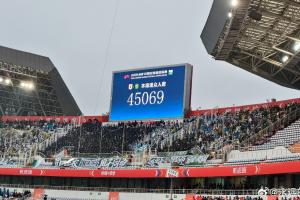 體育資訊03月14日訊 中超第2輪,山東泰山主場對陣北京國安的比賽正在進行?,F(xiàn)場大屏幕顯示,本場比賽的到場人數(shù)為45069人。