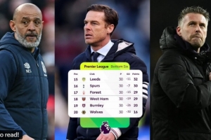 本輪英超在積分榜后6位的球隊中,有5隊都拿到1分(狼隊還未賽),其中利茲聯(lián)0-0戰(zhàn)平水晶宮,諾丁漢森林0-0戰(zhàn)平富勒姆,西漢姆1-1戰(zhàn)平曼城,伯恩利0-0戰(zhàn)平伯恩茅斯。
