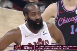 騎士VS公牛,哈登首節(jié)兩次打成3+1,轉(zhuǎn)播方曬統(tǒng)計:哈登本賽季50次造成三分球犯規(guī)領(lǐng)跑全聯(lián)盟,加入騎士之后已經(jīng)9次。