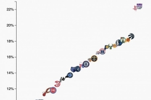 本賽季各球隊中投(10英尺-三分線之間)占比如圖所示,擁有德羅贊的國王和杜蘭特的火箭占比超過22%,聯(lián)盟獨一檔,公牛則不到7%聯(lián)盟最低,也算獨一檔。