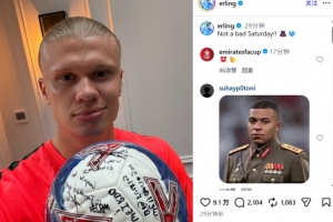 哈蘭德也在賽后通過社媒曬出了隊(duì)友們簽名的足球,并調(diào)侃道:“周六過得還不錯(cuò)????”