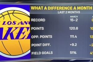 三月湖人的戰(zhàn)績是15勝2負(fù),場均得到120.6分,失分111.4,凈勝分+9.2,命中率51%;