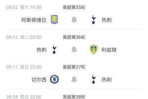 在剩余的最后6輪比賽中,熱刺三個(gè)主場(chǎng)三個(gè)客場(chǎng),將客場(chǎng)對(duì)陣維拉、切爾西,最后一輪主場(chǎng)對(duì)陣埃弗頓。
