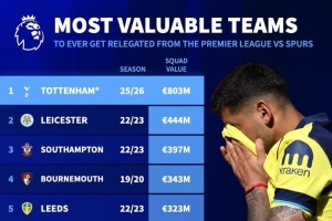 體育資訊4月13日訊 據(jù)德國轉(zhuǎn)會(huì)市場統(tǒng)計(jì),如果熱刺本賽季降級,將成為英超歷史上身價(jià)最高的降級球隊(duì)。