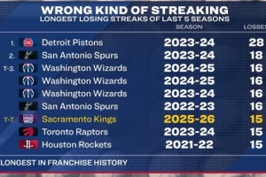 國王本賽季的15連敗已創(chuàng)隊史最差紀錄