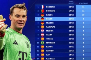 體育資訊4月16日訊 今天凌晨,拜仁淘汰皇馬進(jìn)入歐冠四強(qiáng),諾伊爾已經(jīng)9次參加歐冠四強(qiáng),并列第三。