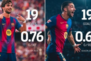 巴薩官方也曬出數(shù)據(jù)對比照,表示費蘭本賽季已打進19球,追平他個人上賽季的總進球數(shù)。與此同時,費蘭的每90分鐘進球數(shù)也從上賽季的0.64球升至本賽季的0.76球。