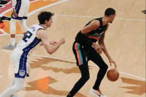 GIF-文班背打雷諾 假轉(zhuǎn)身晃暈雷諾 底線視角才看清 是一個(gè)單手胯下讓雷諾偏離了重心