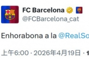 體育資訊4月19日訊 國王杯決賽已經(jīng)完賽,馬競在點(diǎn)球大戰(zhàn)中3-4不敵皇家社會。巴薩官推在賽后第一時間發(fā)推:“祝賀@皇家社會贏得國王杯冠軍。”