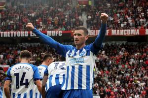 第45+3分鐘,格羅斯前場右路高空球傳中到禁區(qū)內,三笘薰后點小角度凌空抽射破門。