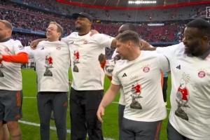 今天凌晨,拜仁4-2擊敗斯圖加特,將隊史第35座聯(lián)賽冠軍完美收入囊中。賽后,安聯(lián)球場內(nèi)洋溢著狂歡的氣氛,而主角是一件極其特別的紀念衫。