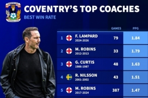 蘭帕德執(zhí)教考文垂以來帶隊參加79場比賽,場均拿到1.84分,考文垂歷任主帥場均拿分最多(至少執(zhí)教30場)。