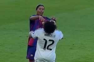 巴薩傳奇隊vs皇馬傳奇隊的表演賽在美國洛杉磯進(jìn)行,比賽中小羅開玩笑推搡馬塞洛,后者順勢倒地,復(fù)制了昔日國家德比的“火藥味”。