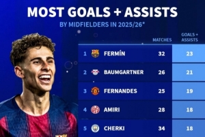 體育資訊2月24日訊 《轉(zhuǎn)會市場》統(tǒng)計了本賽季五大聯(lián)賽中場球員在各項賽事直接參與進球情況,費爾明領(lǐng)跑。