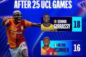 數(shù)據(jù)統(tǒng)計(jì)顯示,奧斯梅恩(尼日利亞)在25場歐冠后打進(jìn)16球,也超越了藍(lán)軍傳奇德羅巴(科特迪瓦)的同期數(shù)據(jù)(15球),在非洲球員中僅次于18球的吉拉西(幾內(nèi)亞)。
